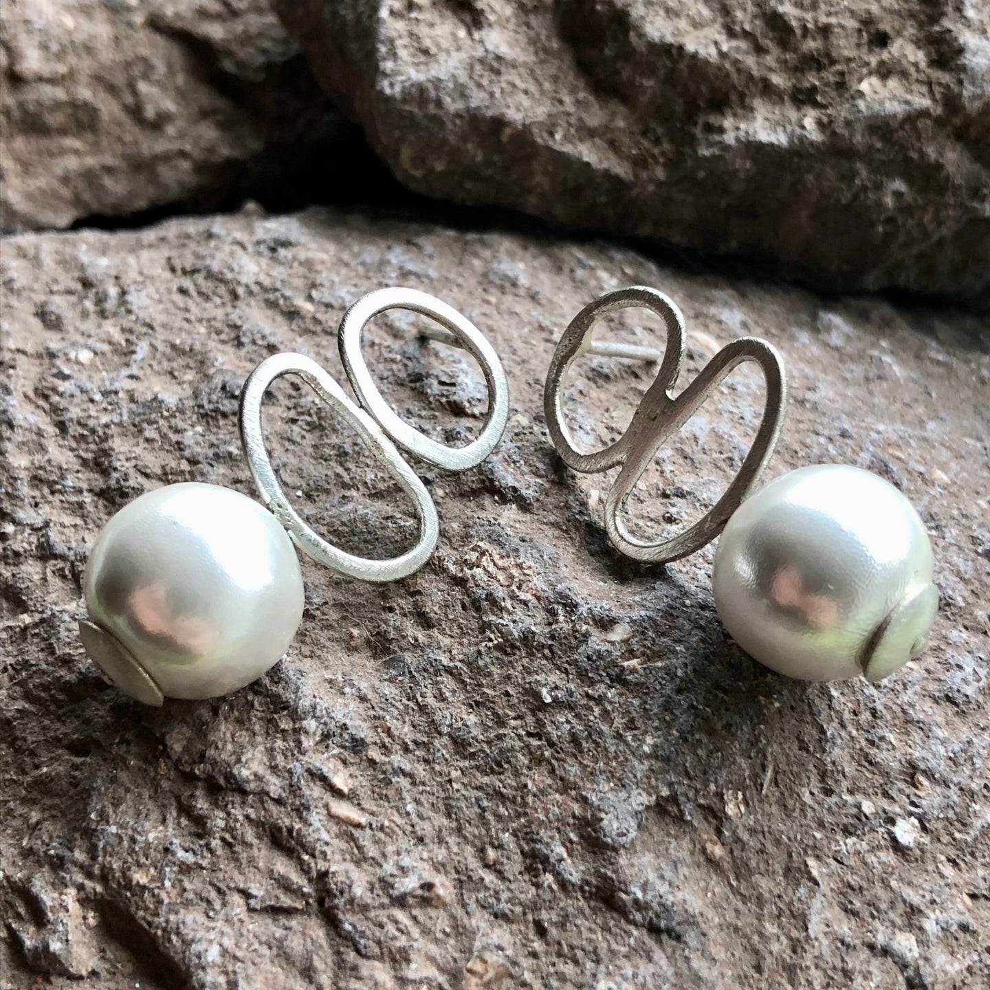 Aros de algodón prensado blanco con plata. 30mm largo 26mm ancho, esfera 13mm. Muy livianos y luminosos!