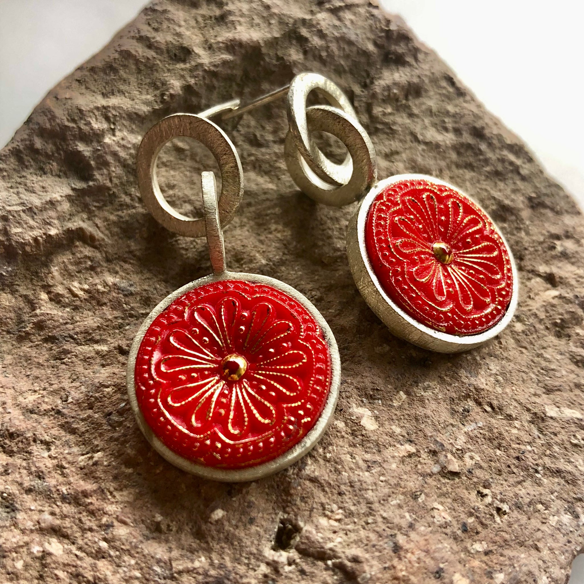 Aros de plata con botones de vidrio checo vintage (2cm). Largo 3,8cm.