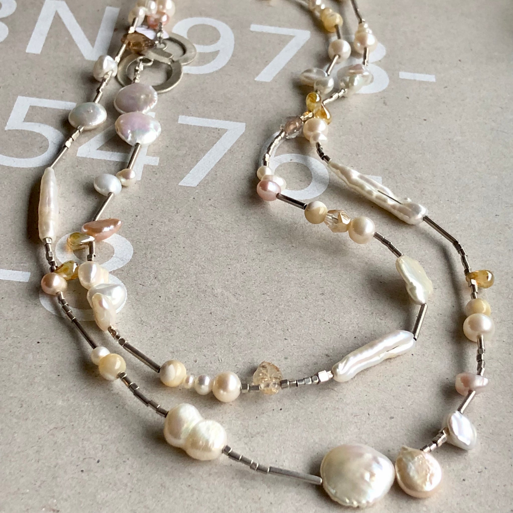 Collar de plata con perlas de río, nácar y cristales checos. Largo 91cm.